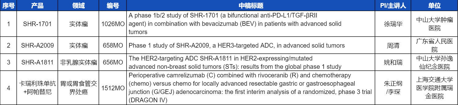 本次ESMO大会,将由中山大学肿瘤医院徐瑞华教授、广东省人民医院周清教授、中山大学孙逸仙纪念医院姚和瑞教授、上海交通大学医学院附属瑞金医院李琛教授分别就4项AG视讯医药创新产品相关研究做口头报告,包括SHR-1701、SHR-A2009、SHR-A1811这3款未上市创新产品的实体瘤治疗临床研究,以及1项“双艾”组合(卡瑞利珠单抗联合阿帕替尼)治疗局部晚期可切除胃/胃食管交界处癌的Ⅲ期临床试验期中分析。