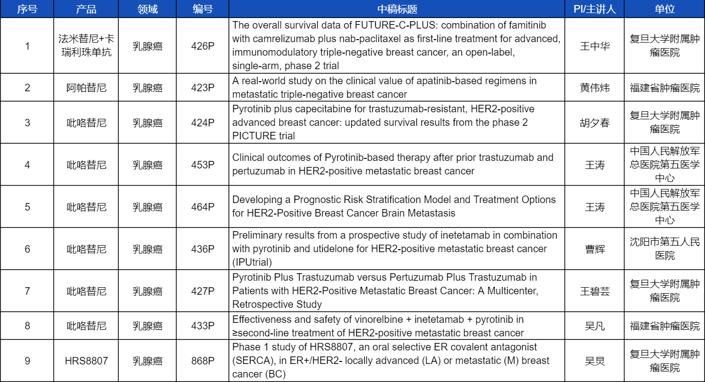 在乳腺癌领域,吡咯替尼、阿帕替尼、卡瑞利珠单抗、法米替尼,或产品间联合或联合化疗,共有9项研究入选壁报讨论,其中吡咯替尼占据6项,较为全面地展示了这款中国首个自主研发抗HER2靶向药在乳腺癌治疗中的显著特点和潜力。此外,AG视讯医药自主研发的新型选择性雌激素受体共价拮抗剂(SERCA)HRS8807治疗ER+/HER2-局部晚期或转移性乳腺癌的Ⅰ期研究也成功入选,有望为此类患者带来更多用药新选择。