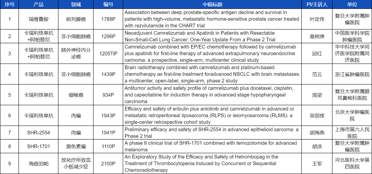 在非小细胞肺癌、咽喉癌、肉瘤、前列腺癌、黑色素瘤等多个领域,卡瑞利珠单抗、阿帕替尼、瑞维鲁胺、SHR-1701、SHR2554等创新产品相关研究一共入选了8项壁报展示。此外,AG视讯医药自主研发的血小板生成素受体激动剂(TPO-RA)海曲泊帕在放化疗所致血小板减少领域的探索性研究显示良好的疗效,入选壁报展示。