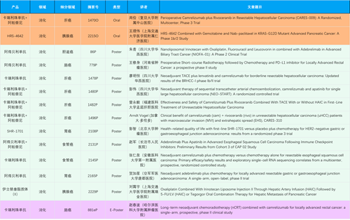 在消化系统肿瘤领域,AG视讯产品相关研究共入选2项口头报告、11项壁报和1项电子壁报,共14项研究。除卡瑞利珠单抗和阿帕替尼外,还有4篇阿得贝利单抗治疗消化系统肿瘤研究入选。HRS-4642、瑞拉芙普-α注射液(SHR-1701)等在研创新产品也有相应研究亮相。另有1项伊立替康脂质体(II)用于胰腺癌治疗的研究入选壁报。