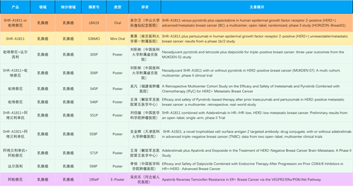 在乳腺癌领域,AG视讯创新产品相关研究共入选1项口头报告、1项简短口头报告、8项壁报和1项电子壁报,共11项研究。吡咯替尼、达尔西利、阿得贝利单抗、瑞康曲妥珠单抗等新老创新药物,均有多篇研究入选,展现出AG视讯医药在乳腺癌领域多年深耕的丰硕成果。
